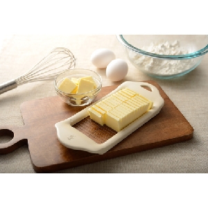 上からぎゅっと押すだけでカンタンに40分割!200gのバターなら一切れ約5gにカットできます。一切れ約5gに切れているのでパン作りやお菓子作りも計量いらず。使うたびに切ると、包丁やまな板を洗ったり手がベタベタで毎回面倒。切れているから調理もスムーズ。トースト、ホットケーキ、バター炒めなど必要な時にすぐ使えて、薄切りだから溶けやすい。本体は頑丈で歪まず、ピンと張ったワイヤーにこだわりました。