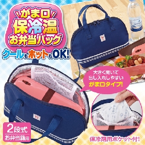 保冷・保温ができるがま口タイプのお弁当箱用バッグ!保冷材用ポケット付き。(保冷剤は付きません。)持ち運びに便利な持ち手付き。2段式お弁当が入ります。