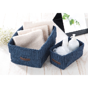 手編みでつくられたやわらかい収納用ボックス。水にぬれても乾きやすい素材で洗えるので、洗面所での使用に便利です。