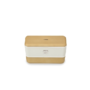スタイリッシュなカラーとロゴデザインのおしゃれな2段ランチボックス!木目調の上蓋とワンポイントのデザインが落ち着いた印象で、食べ終わったらすっきり1段にできる入れ子式です。