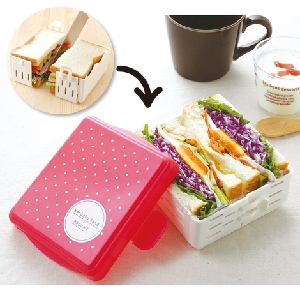 パンと具材をサンドしていき、ガイドに合わせて包丁でカット。その後ケースの方向を変えて組みかえれば、そのまま持ち運べるサンドイッチのランチボックスが出来上がり!厚めのサンドイッチでも大丈夫。誰でも上手にサンドイッチが作れる、スグレもののランチボックスです。